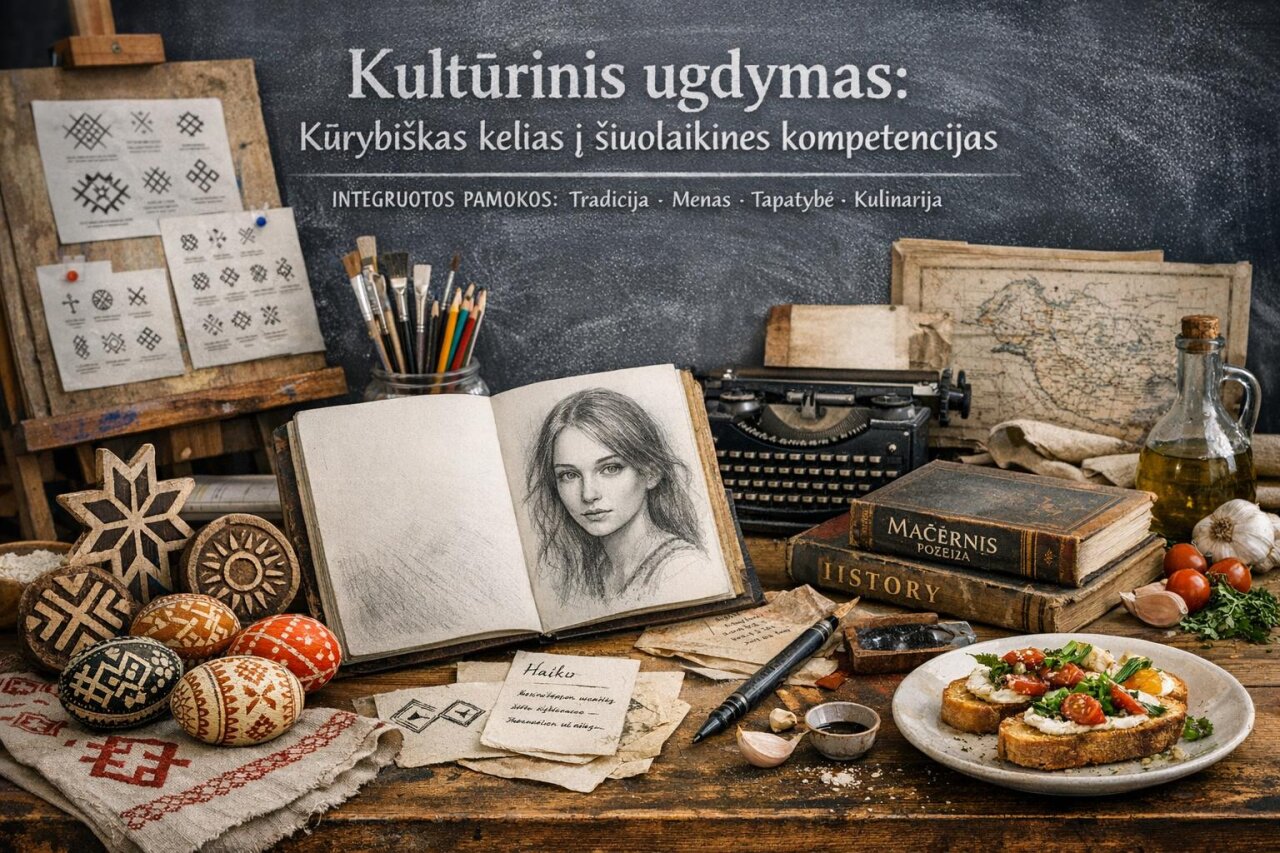 Siekdami praktiškai įgyvendinti šias nuostatas, parengėme integruotų pamokų ciklą. Jame dailė, technologijos, lietuvių kalba ir istorija susijungia į bendrą patyriminį procesą – nuo tradicinių baltų simbolių tyrinėjimo iki modernių haiku ar kulinarinio paveldo interpretacijų.